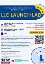 The Small Business Development Center at Arizona Western College is hosting a hands-on workshop designed to guide you through the process of forming your LLC or PLLC. Learn everything you need to confidently launch your business—from choosing a name to filing your Articles of Organization.