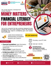 The Small Business Development Center (SBDC) at Arizona Western College will host “Money Matters: Financial Literacy for Entrepreneurs,” a no-cost workshop designed to help small business owners and aspiring entrepreneurs strengthen their financial knowledge and skills.